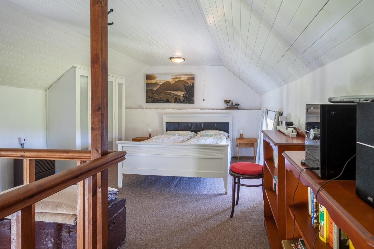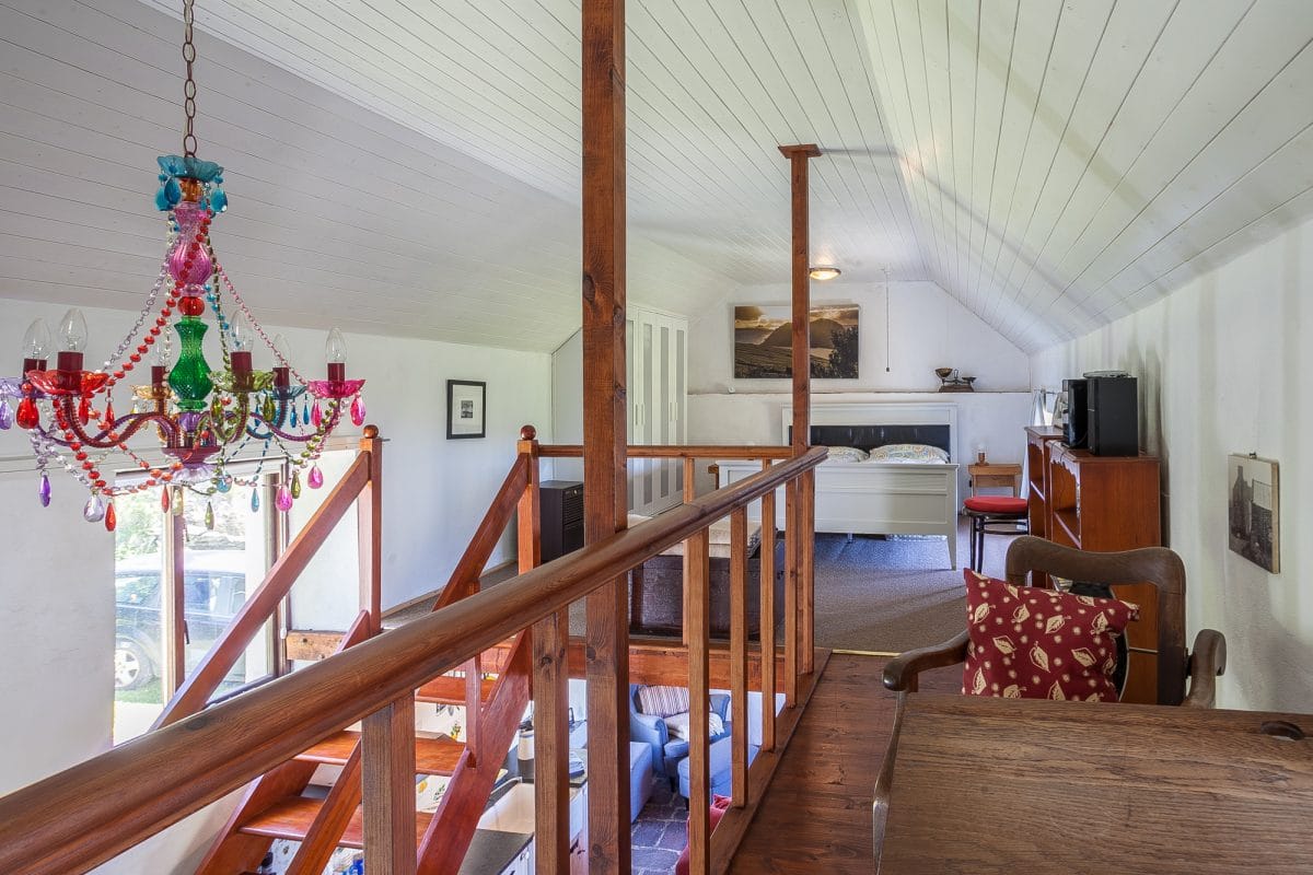 Ein geräumiger Eingangsbereich verbindet den Hauptraum mit einem Badezimmer, eine steile Treppe führt in ein weiteres kleines Schlafzimmer.