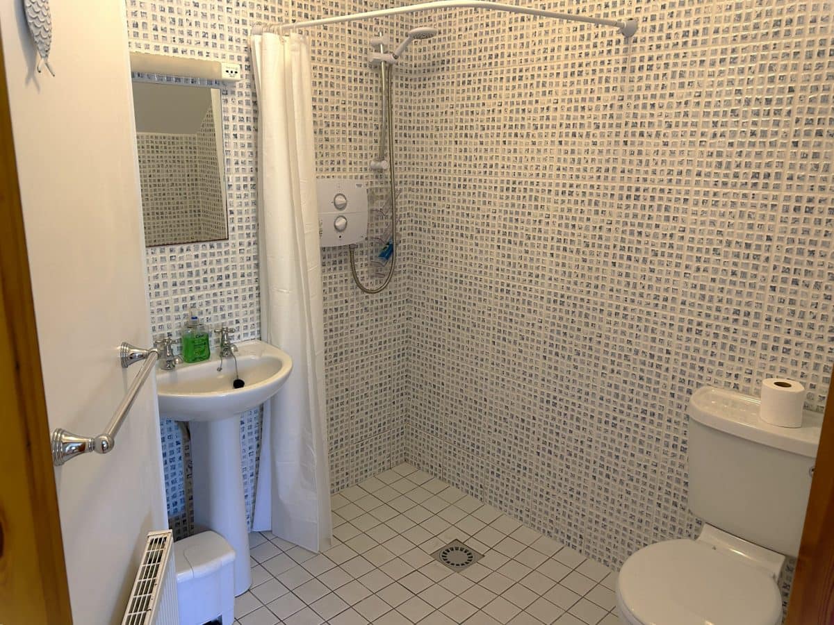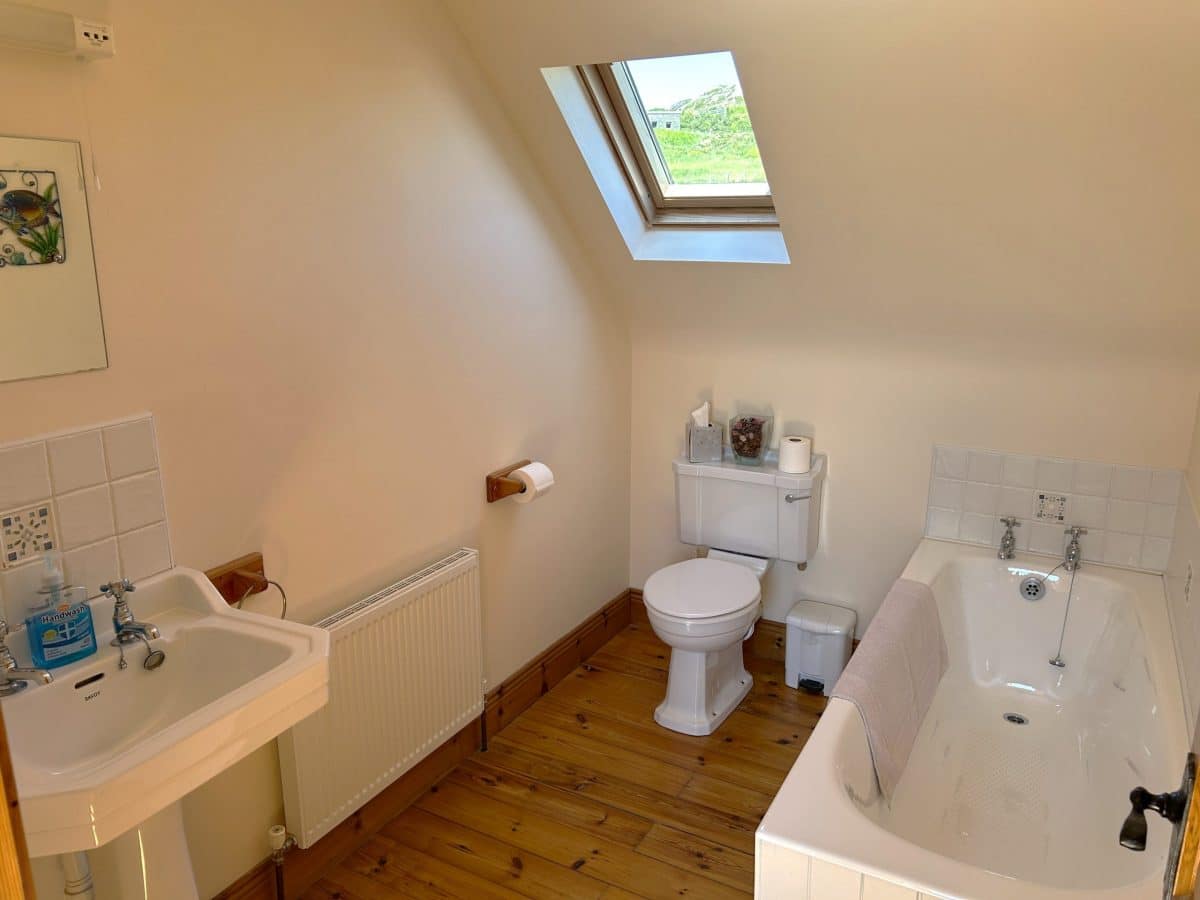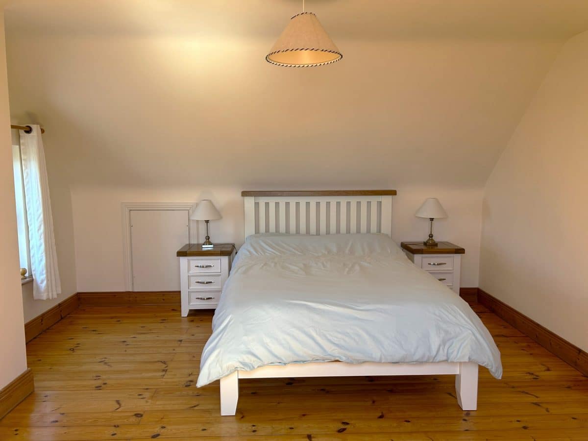 Ein geräumiger Flur trennt den Wohnbereich von einem Schlafzimmer (Doppelbett) mit eigenem Dusch-Bad. Im Obergeschoß befinden sich zwei weitere Schlafzimmer (Doppelbett /2 Einzelbetten) und ein separates Badezimmer.