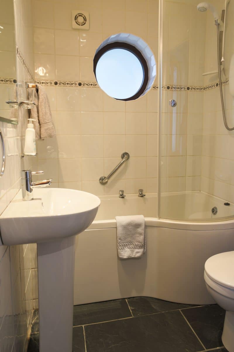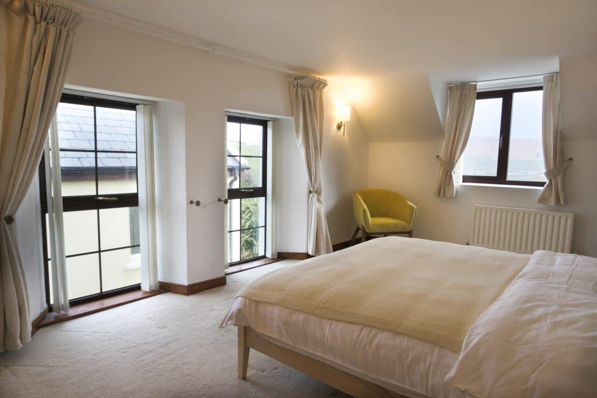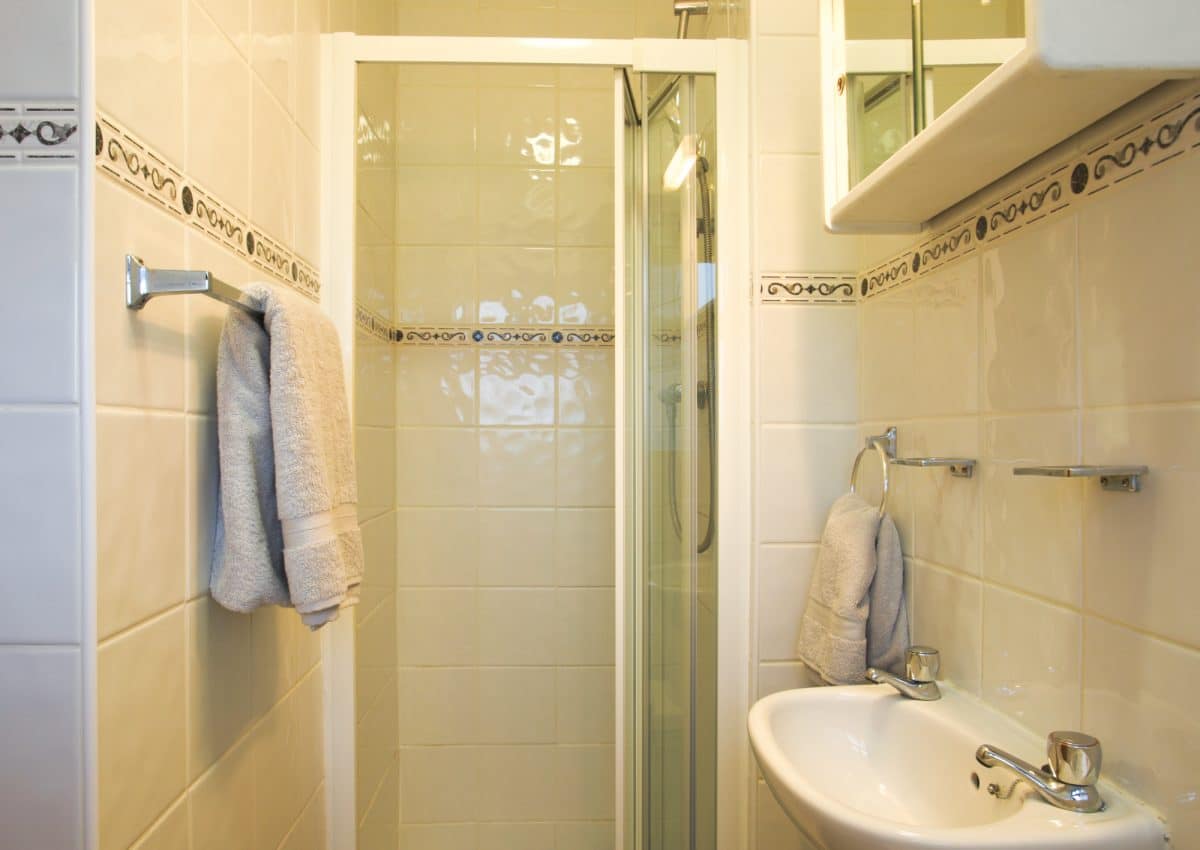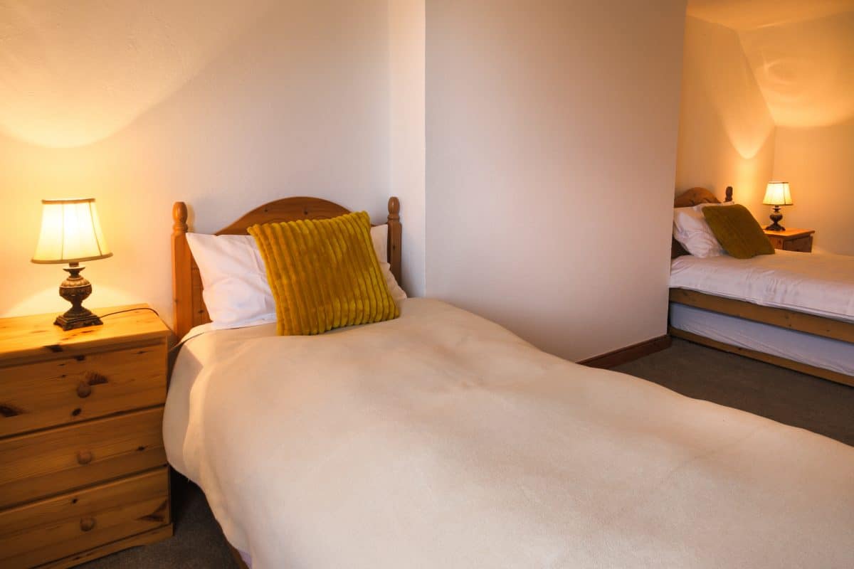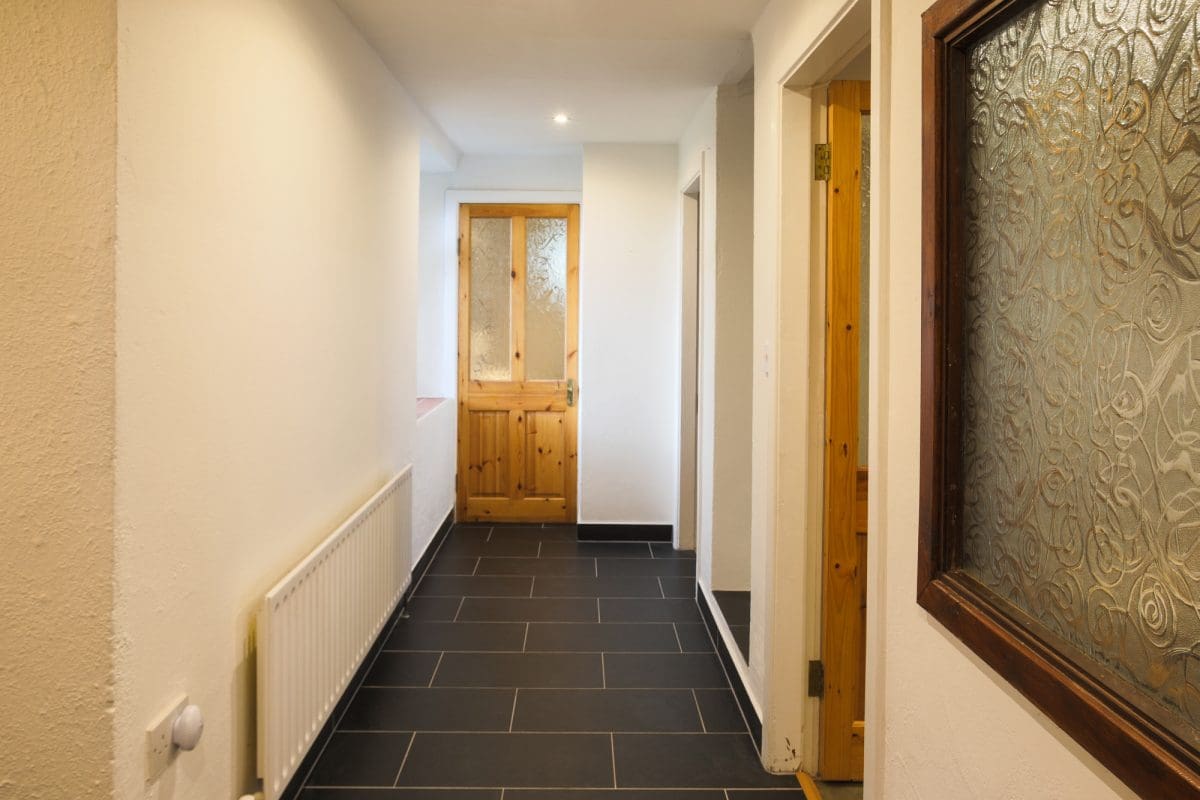Vom Flur aus hat man Zugang zur Küche und in die beiden Bäder. Über eine weitere Treppe gelangt man zu den beiden Schlafzimmern im Obergeschoss. Davon hat eines ein Doppelbett und das andere zwei Einzelbetten. Das Schlafzimmer im Erdgeschoss ist mit einem Doppelbett ausgestattet.