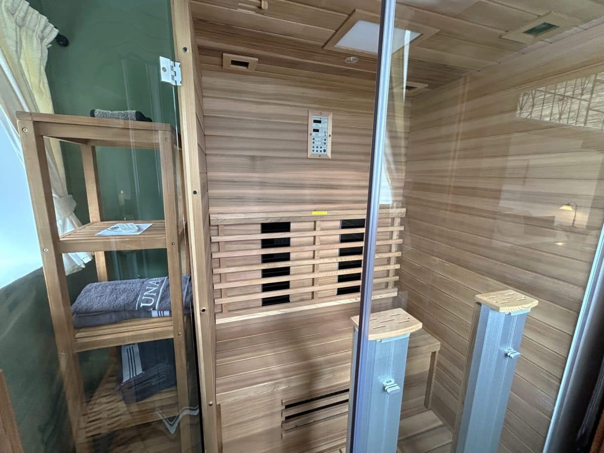 In einem kleinen Zimmer neben dem Wohnzimmer befindet sich eine moderne Infrarot-Sauna. Sie bietet Gästen die Möglichkeit, sich in privater Atmosphäre zu entspannen und neue Energie zu tanken.