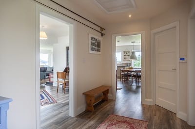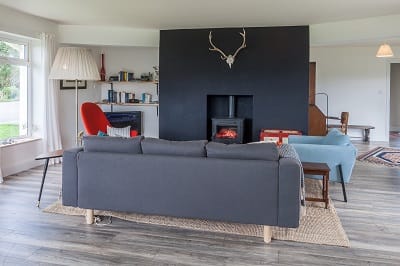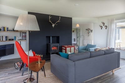 Das Haus ist einladend und geschmackvoll mit viel Liebe zum Detail eingerichtet. Es bietet mit drei Schlafzimmern und zwei Badezimmern reichlich Platz für 5 Personen. Ein Klappbett steht für ein weiteres Kind zur Verfügung. Das grosse Wohnzimmer wirkt sehr gemütlich. Durch ein besonders grosses Panoramafenster können Sie die Aussicht auf den See und den dahinterliegenden Atlantik geniessen oder einfach auf dem gequemen Sofa und den Sesseln vor einem traditionellen Holz-Kaminofen entspannen.