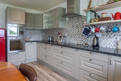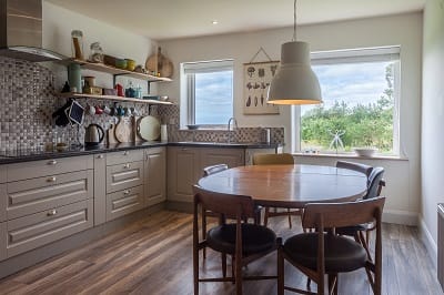- Küche mit moderner Küchenzeile und großem Esstisch
