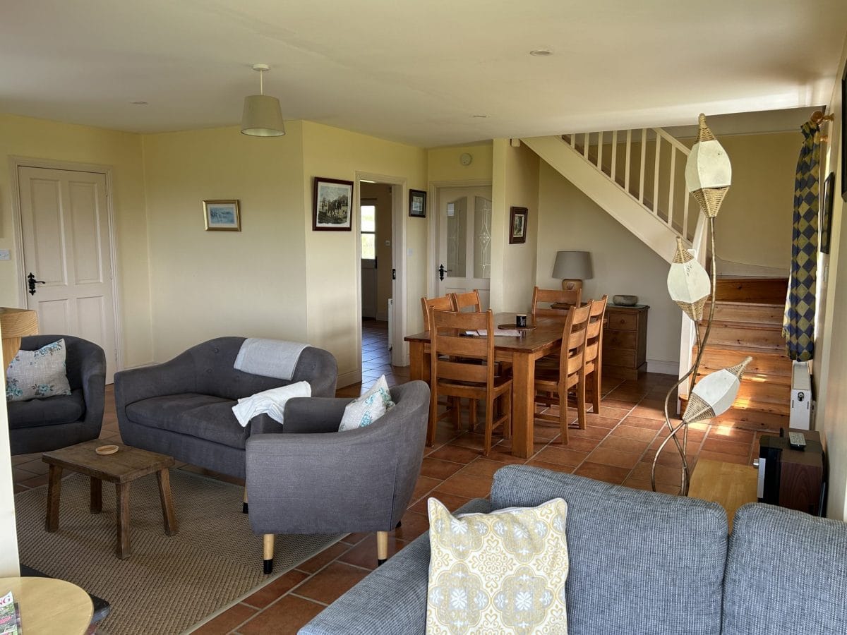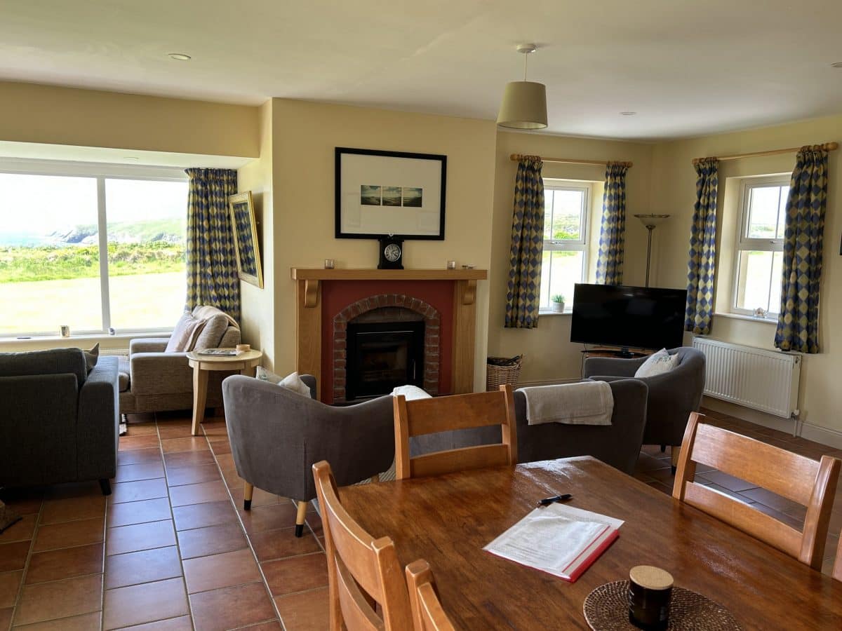 Sie finden im Haus absolute Ruhe und Komfort. SCEILIG BEAG verfügt im Erdgeschoß über einen großzügig dimensionierten Wohnbereich mit großem Eßtisch und Sitzgruppen vorm gemütlichen Kaminofen und Panoramafenster.