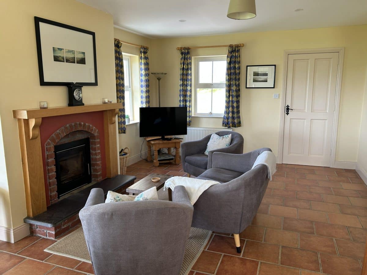 - Sitzgruppe vor Panoramafenster zum Atlantik, weitere Sitzgruppe vor Kaminofen