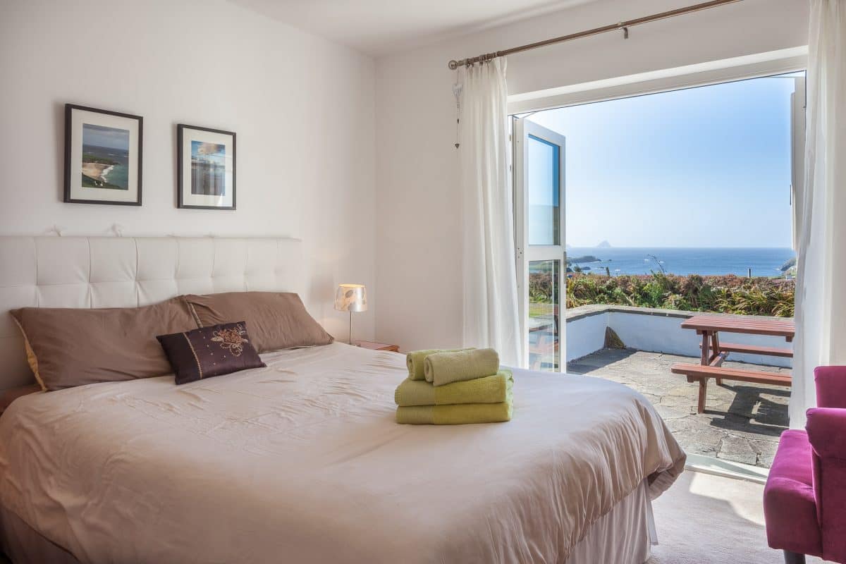 Schlafzimmer 1 mit einem Doppelbett hat eine Tür, die auf die Terrasse führt und erlaubt einen traumhaften Blick auf den ATLANTIK. Schlafzimmer 2 ist mit zwei Einzelbetten möbliert, die zu einem Doppelbett kombiniert werden können.