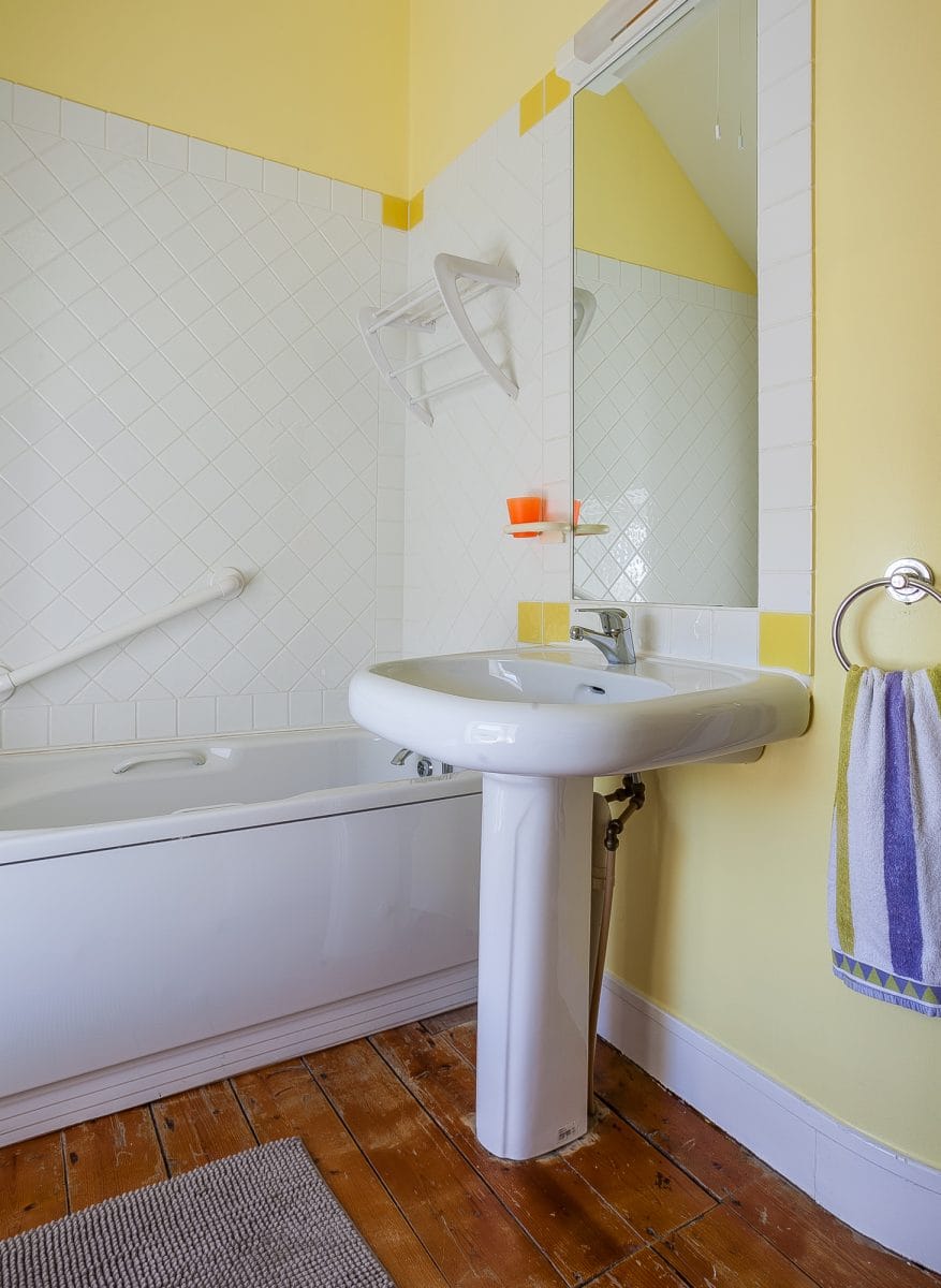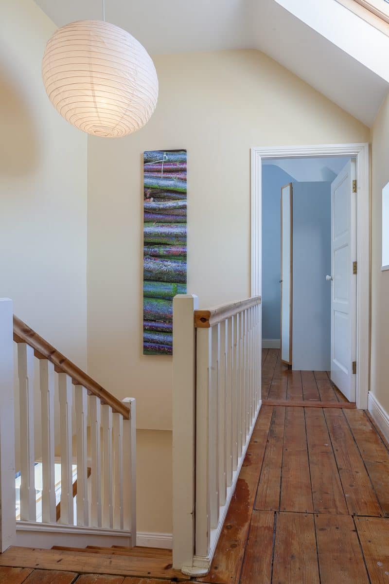 Im Obergeschoß findet man drei Schlafzimmer (eines mit eigenem Dusch-Bad und Meerblick), ein separates Wannenbad und eine kleine Sauna.