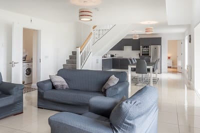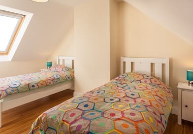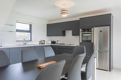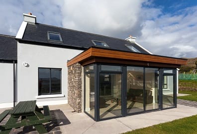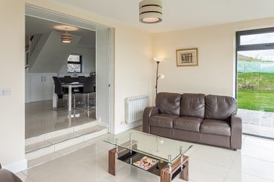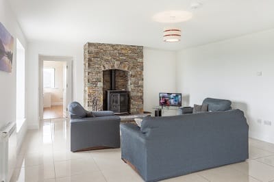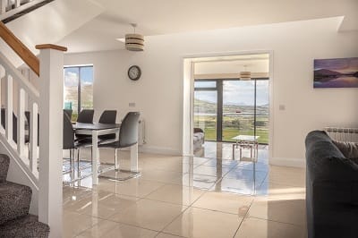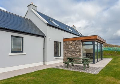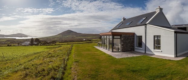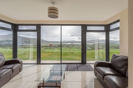 Das neu erbaute Haus TIG TOMAS ist ein grosszügiges und sehr helles Cottage ausserhalb von CAHERSIVEEN. Da das Haus auf einer Anhöhe liegt, hat man einen wunderbaren Blick auf die Insel VALENTIA, ihren Hafen, auf den Caherciveen Kanal aber auch auf den ATLANTIK. TIG TOMAS ist ein modernes, komfortables Ferienhaus und mit vier Schlafzimmern – davon zwei mit eigenem Bad – und bietet somit ausreichend Platz für 8 Erwachsene oder für 2 Familien. Das Haus hat einen Eingangsbereich von dem aus man in den weiträumigen Wohnraum mit offener Küche mit Esstisch gelangt. Eine doppelte Schiebetür bietet Zugang in den grossen, lichtdurchfluteten Wintergarten mit herrlichem Panoramablick über die Gegend. Im Erdgeschoß befinden sich zwei Schlafzimmer je mit Doppelbett und je ein Duschbad. Eine Treppe führt hoch zu einer Galerie und zwei weiteren Schlafzimmern und einem separaten Wannenbad.